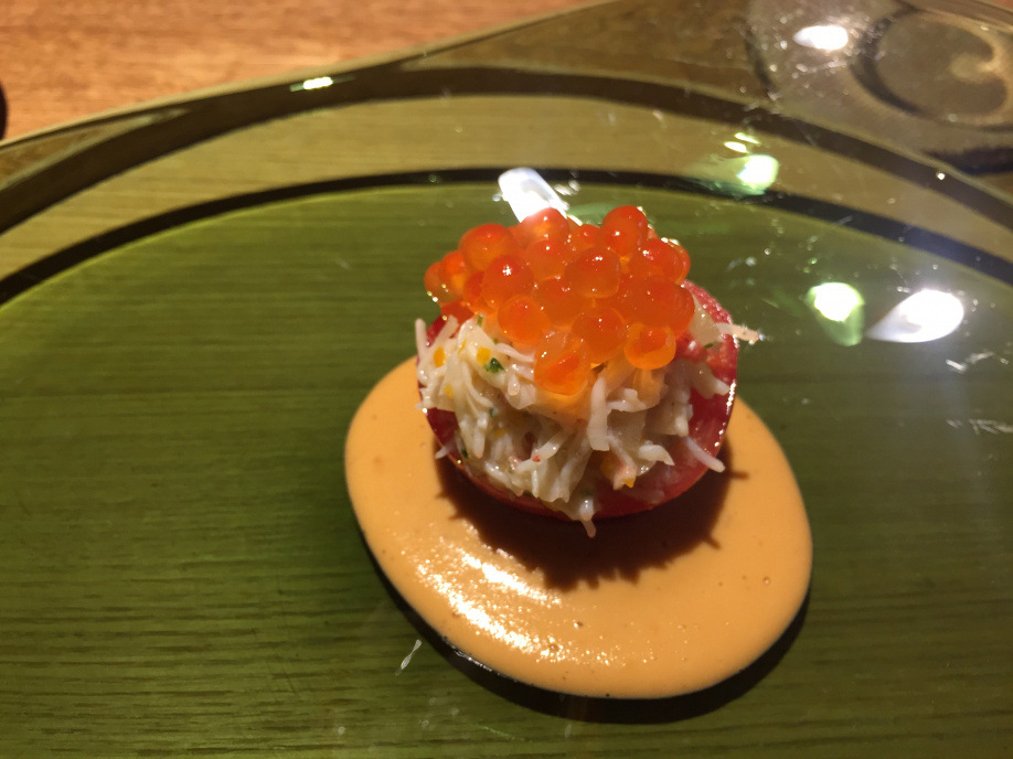 トマトの上に蟹といくら ソースはフォアグラと雲丹です