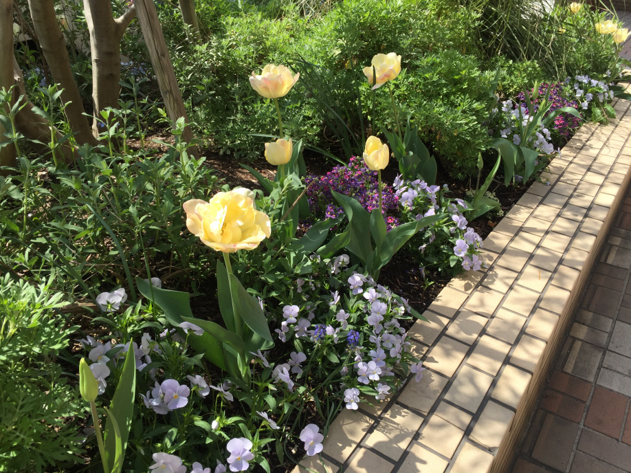 チューリップが咲き、パンジー、ムスカリ、クリーピングタイム、色々なお花が咲いています。