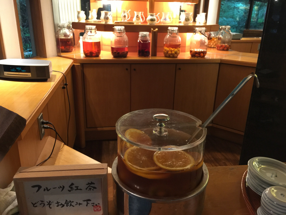 温泉から出ると天然水やフルーツティー、コーヒーが自由に頂けます。