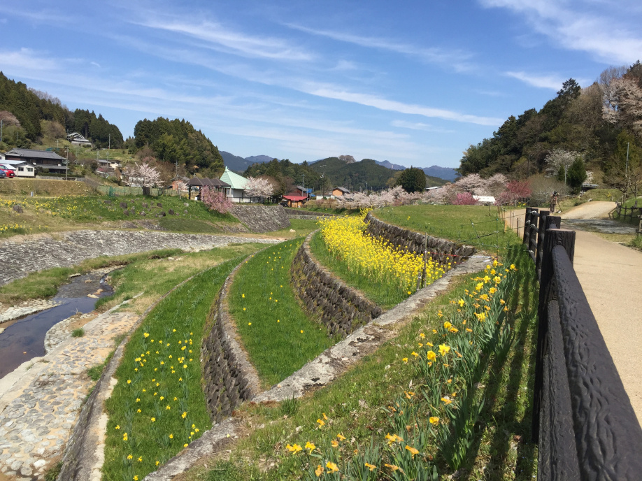 菜の花、水仙が川沿いに植えられ、とっても和かな景色です。
