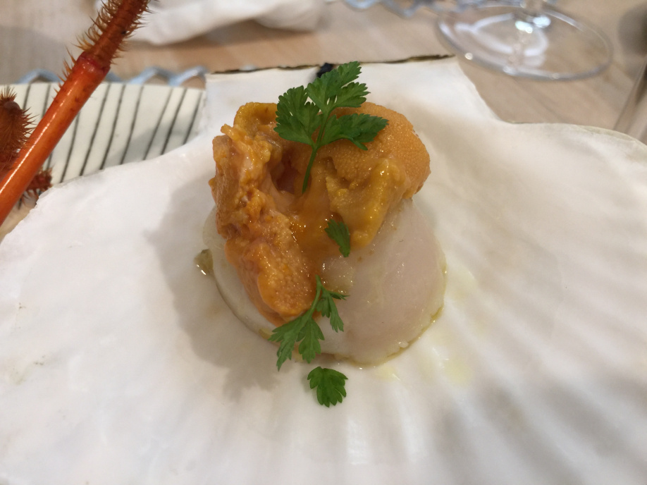 帆立貝にほんのり火を通してます。雲丹をのせて