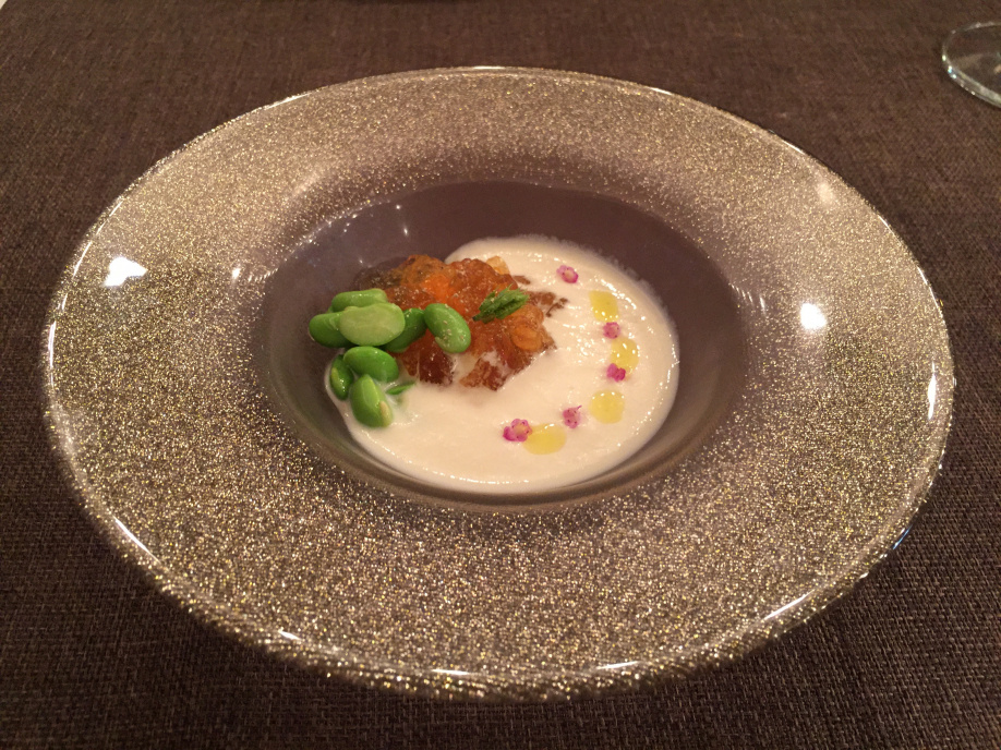めちゃくちゃ美味しいです! 玉ねぎの甘味、雲丹、コンソメジュレ、枝豆の爽やかさ 無言で頂きました^^