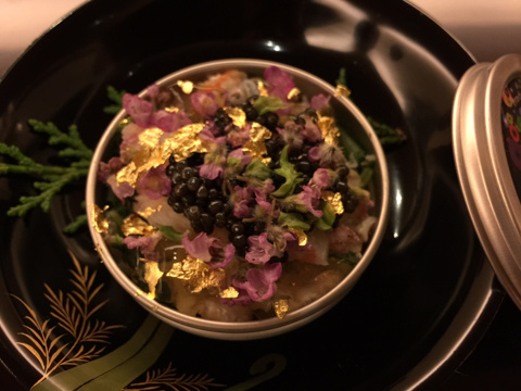 勢子蟹とキャビア 金箔がちりばめられて(この一品とシャンパンでもう満足です)