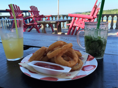 私たちは、海を見ながらオニオンフライとモヒートを。