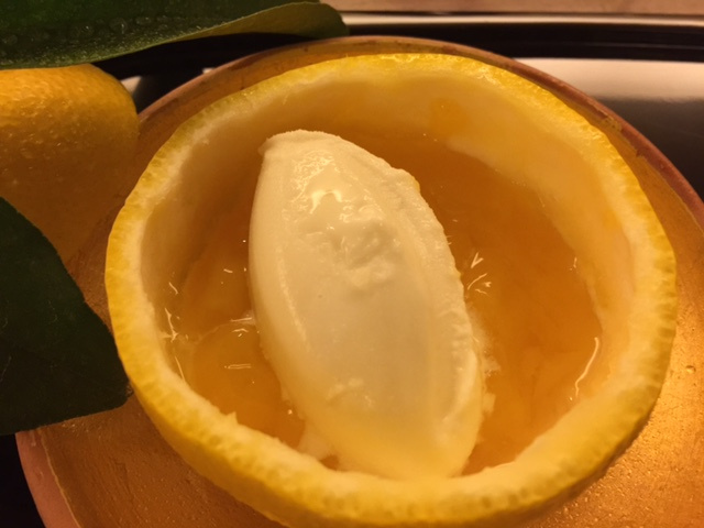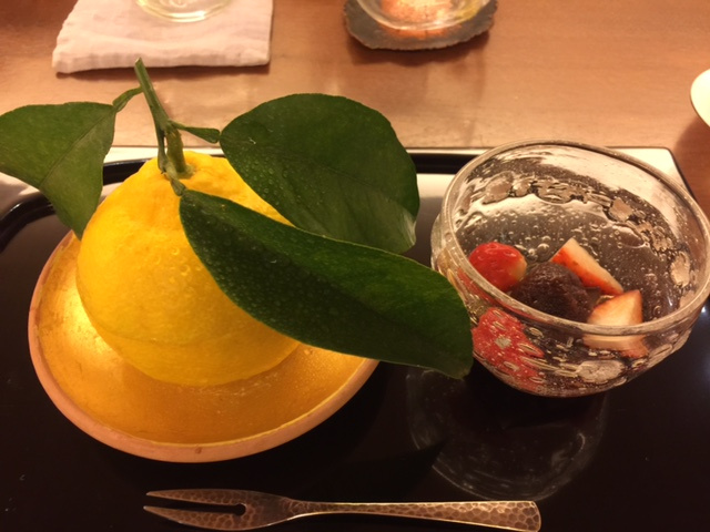 水菓子(枝のついた果肉をぎゅっと絞って今回はアイスと一緒に三宝柑をいただきます。)