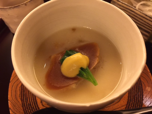 これ一番驚いたお料理でした。自家製からすみの上にはからしが乗っています。とっても美味しかったです。