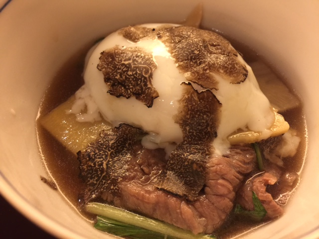 牛肉と温泉卵とトリュフ(すばらしい出汁の効いたすき焼き風)