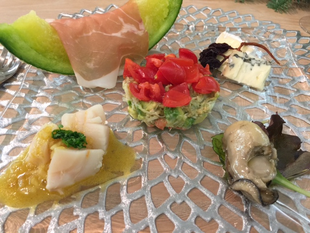 前菜です(アボカドと蟹の前菜・生ハムメロン・ホタテのカレーソース・牡蠣のオイル漬け・チーズ2種)