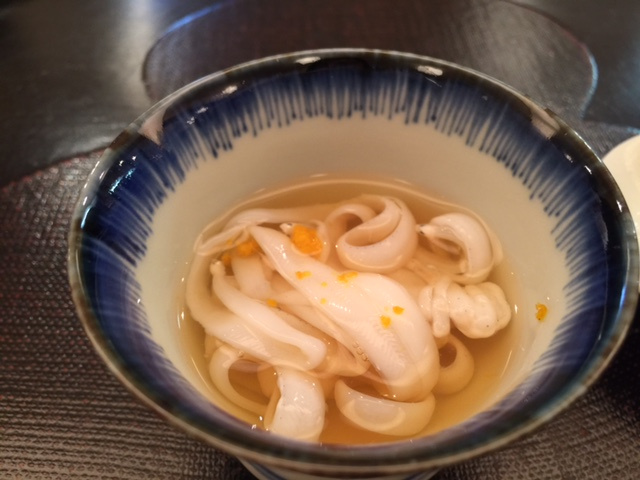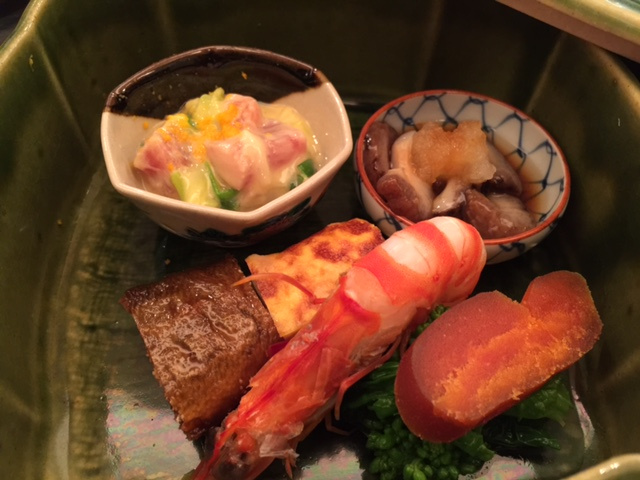 よこわの酢味噌あえ・なまこ(こんなに柔らかいのは初めて)菜の花とからすみ・鮎の甘露煮・卵