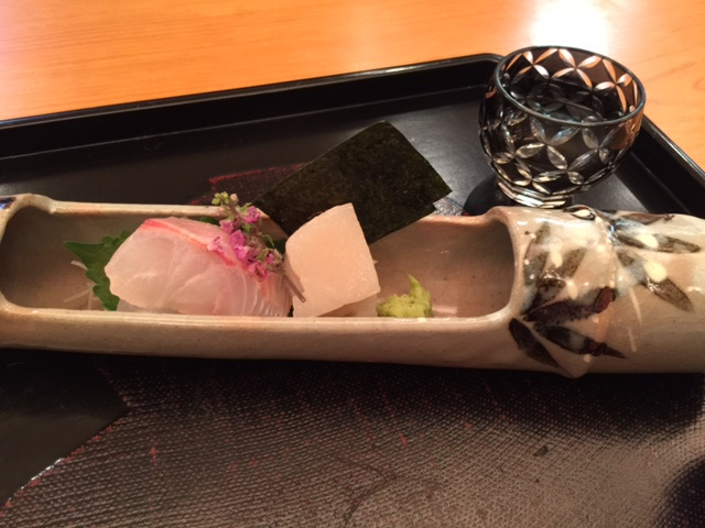 昆布締め鯛と平貝(平貝は海苔で巻いて)器は雪竹で雪降る今日にぴったり