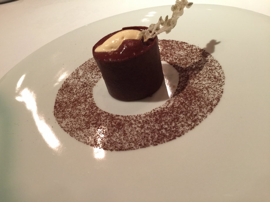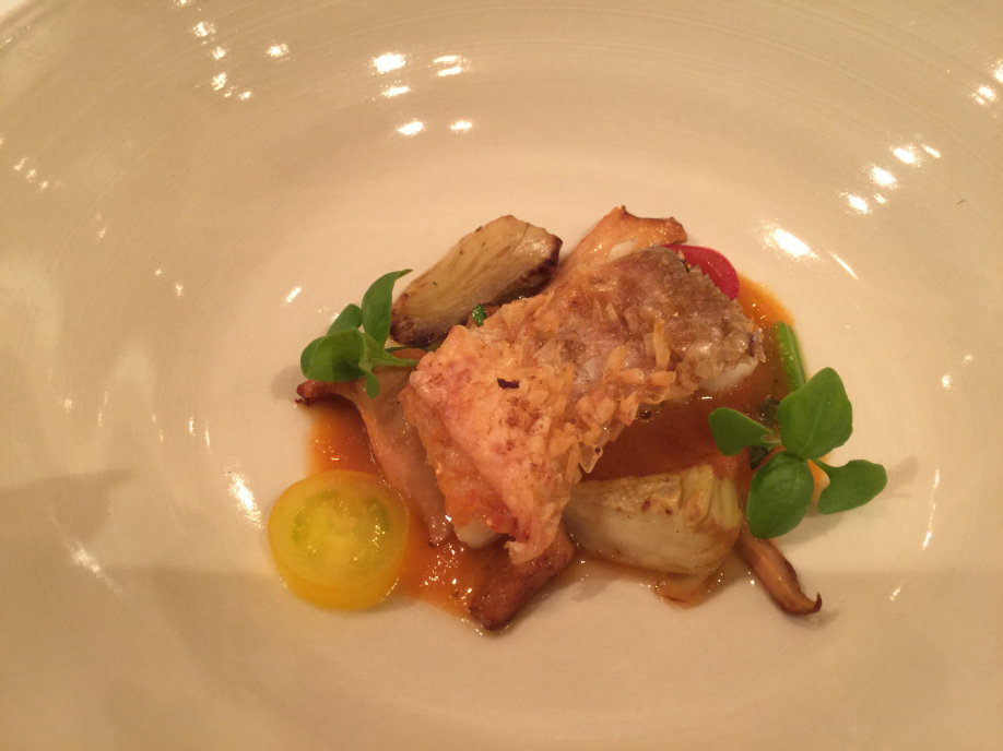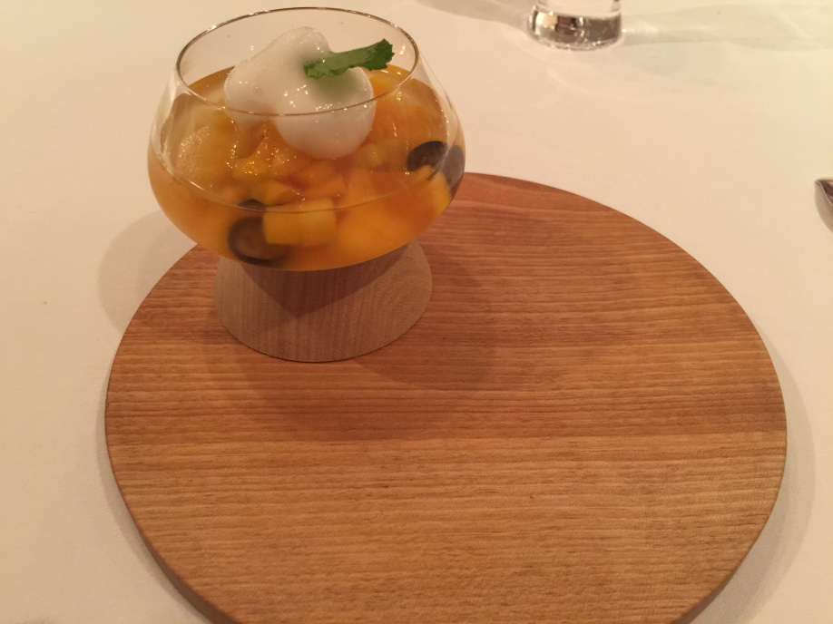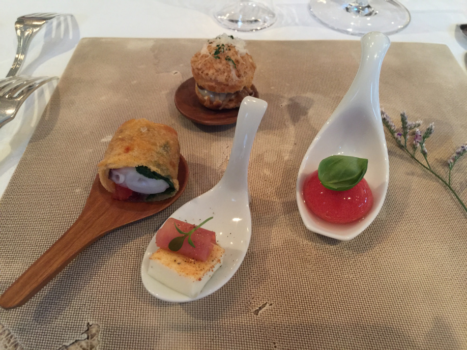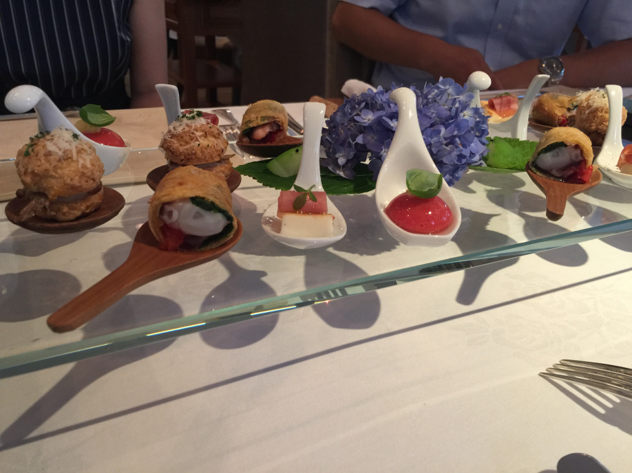 一品目(キャラメルに見えるのは蟹のスープで取った濃縮ソースです。美味しいー)
