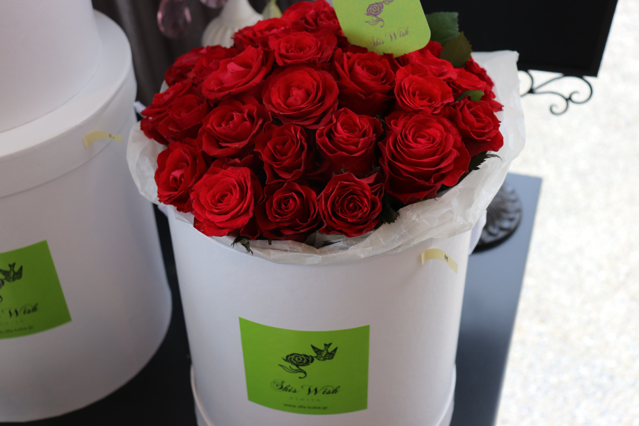 オリジナルのギフトボックスに生花のバラを入れてプレゼント^^